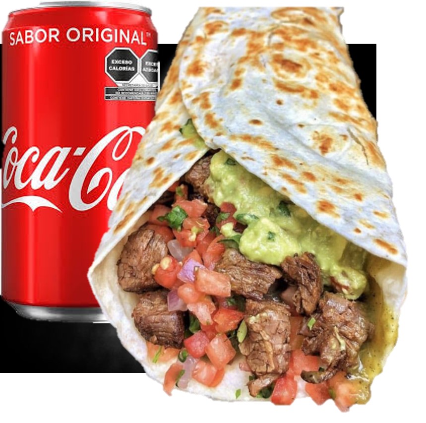 Coca-Cola Original (355 ml, botella plástica) + burrito a elegir: Con guacamole, arroz, frijoles, cebolla y cilantro.