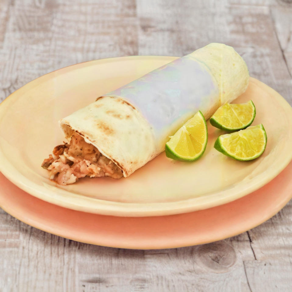 Tortilla de harina va enrollada y por dentro lleva, frijol, queso, cebolla, cilantro, guacamole y carne pastor