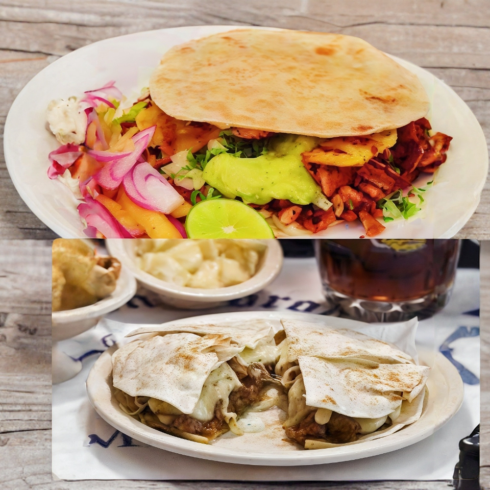 Tortilla de harina , carne al pastor, queso , cebolla, cilantro, arroz, frijoles y guacamole