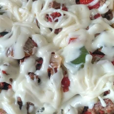 Carne de res, pimiento morrón, cebolla, jamón, tocino.y queso gratinado, tortillas de maiz