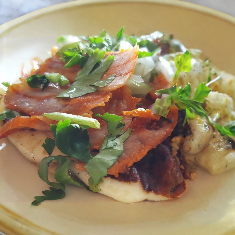 2 tortillas de harina, chuleta, tocino y queso. (180 g).