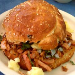 Pan de cemita, carne pastor, cebolla picada, cilantro y piña.