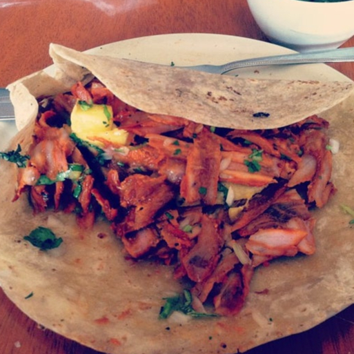 Tortilla de pan árabe o harina, carne pastor, cebolla picada, cilantro y piña.