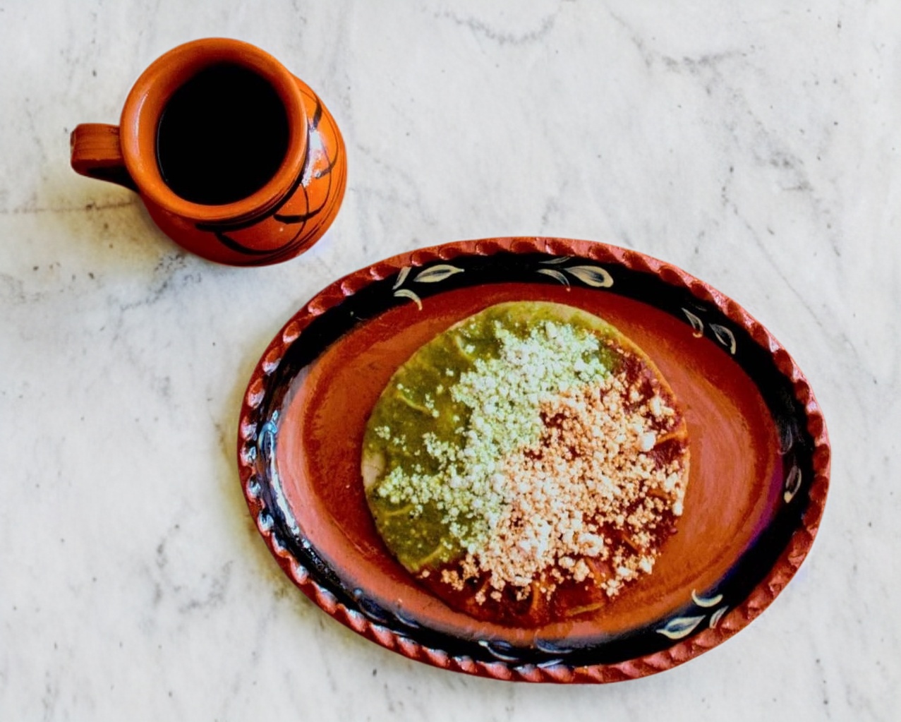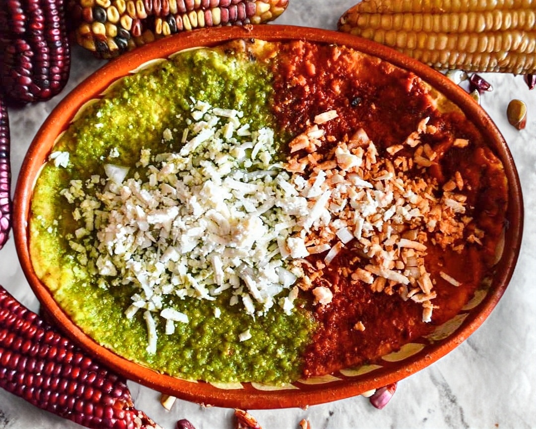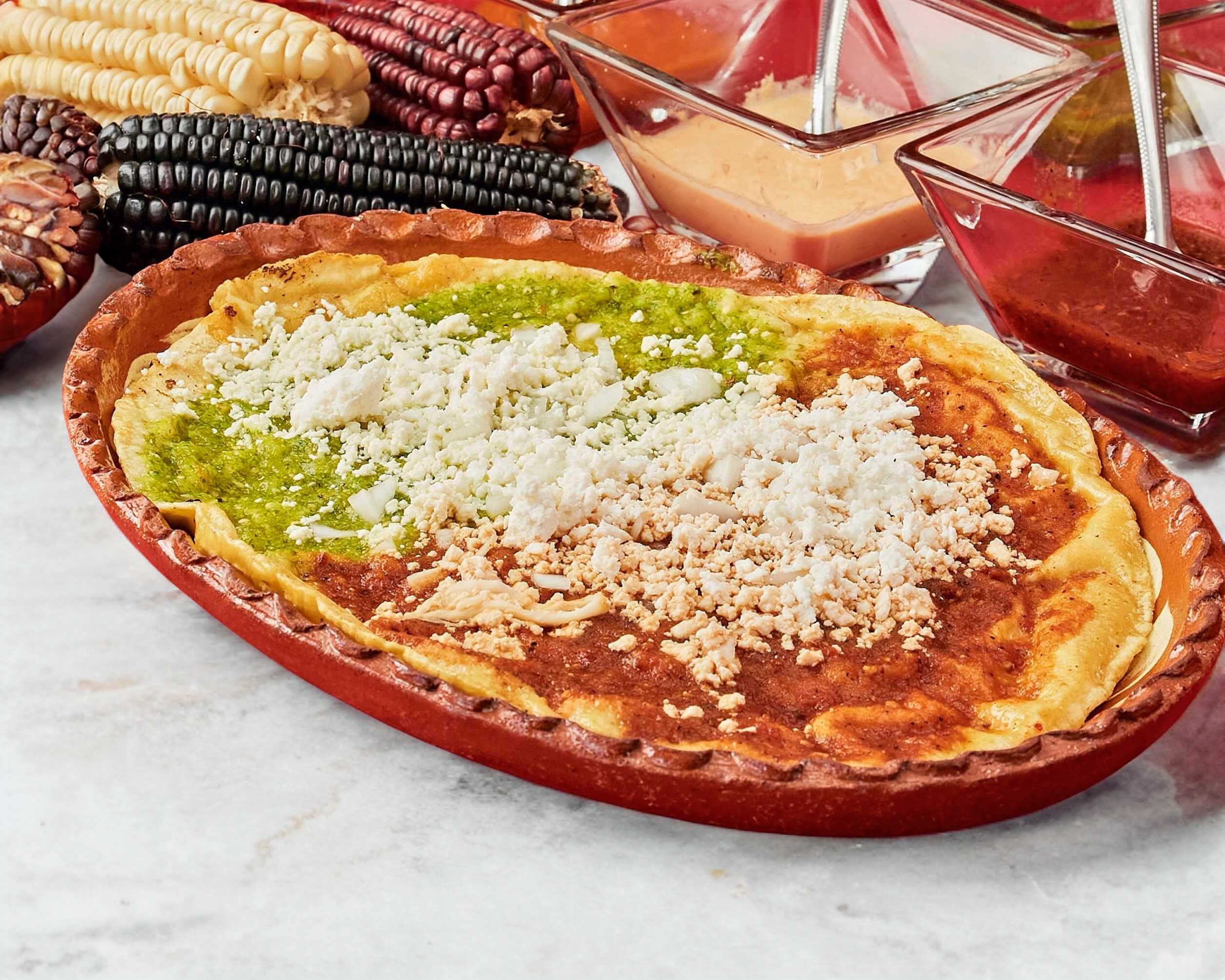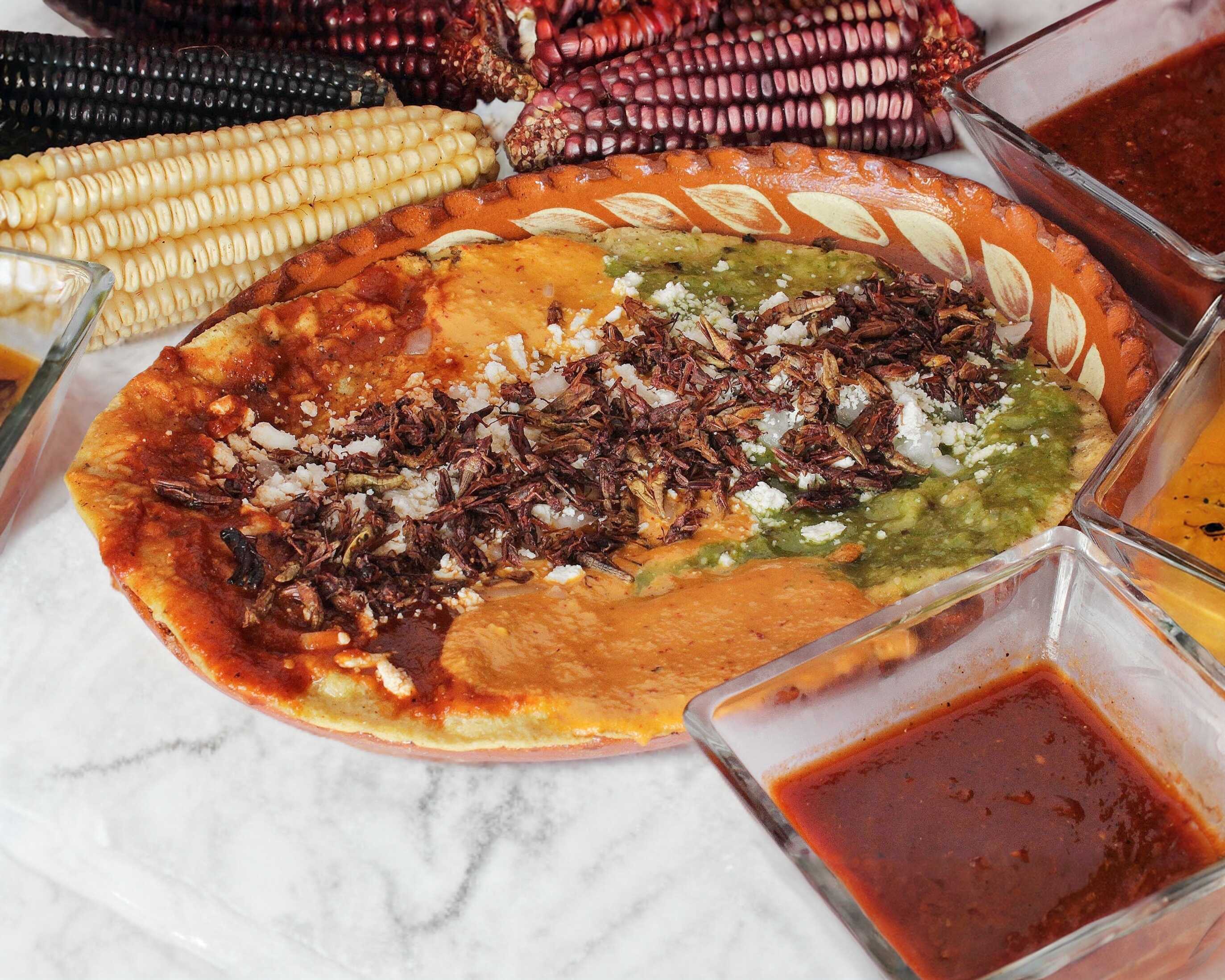 Tortilla de maíz hecha a mano con frijoles en su interior, cubierta de salsa, cebolla, con queso o quesillo, cebolla, chapulines más los ingredientes que prefiera.