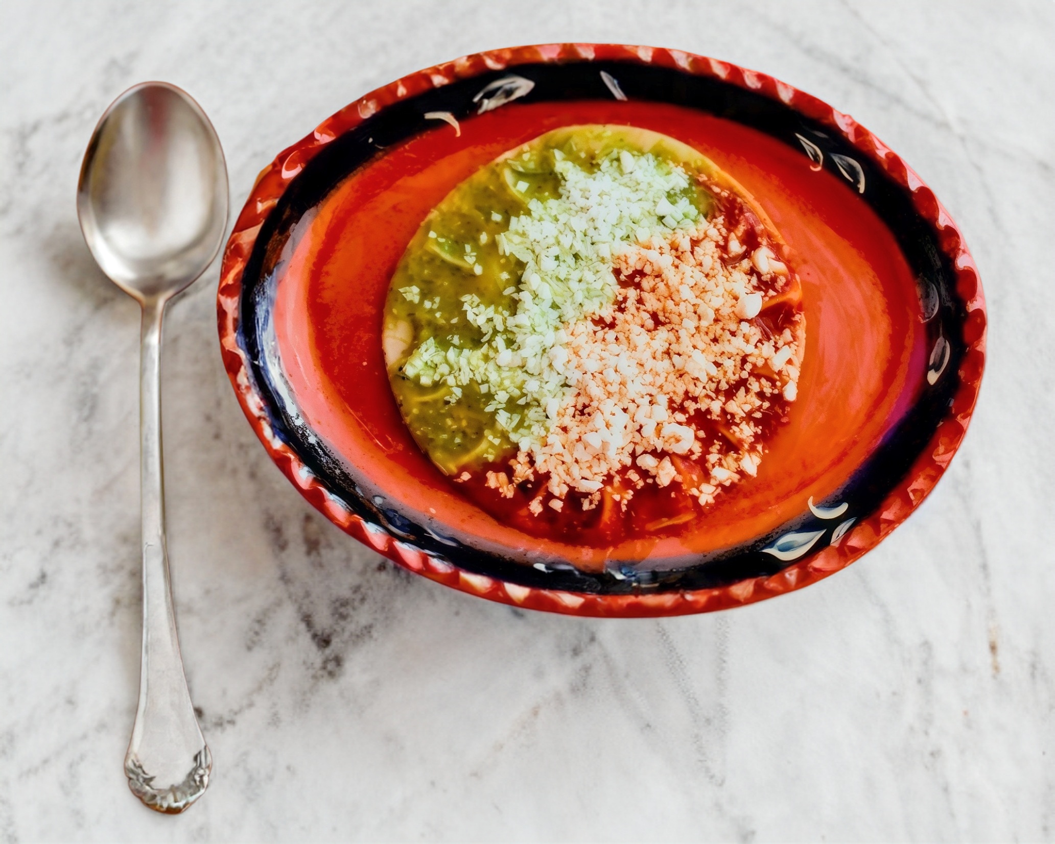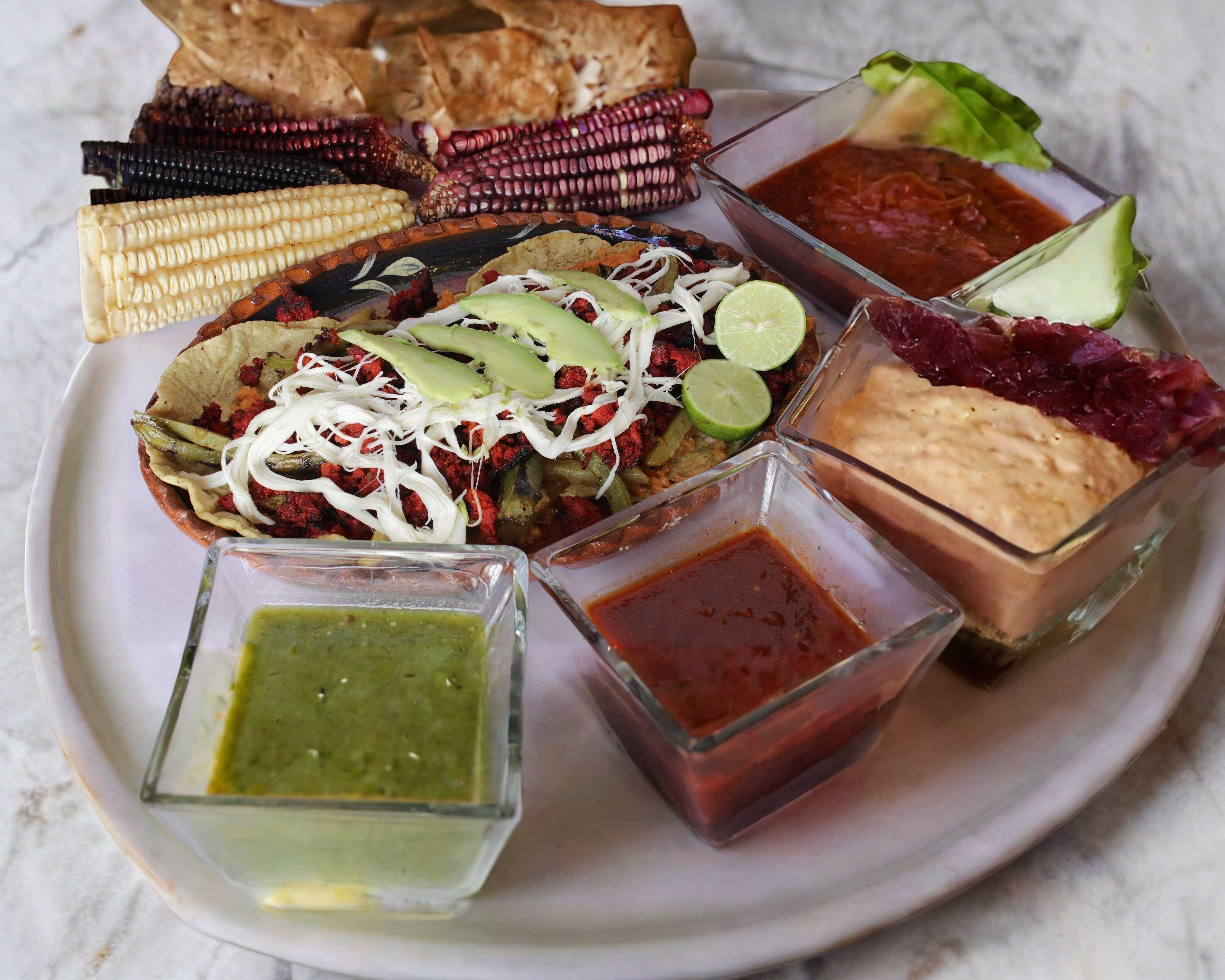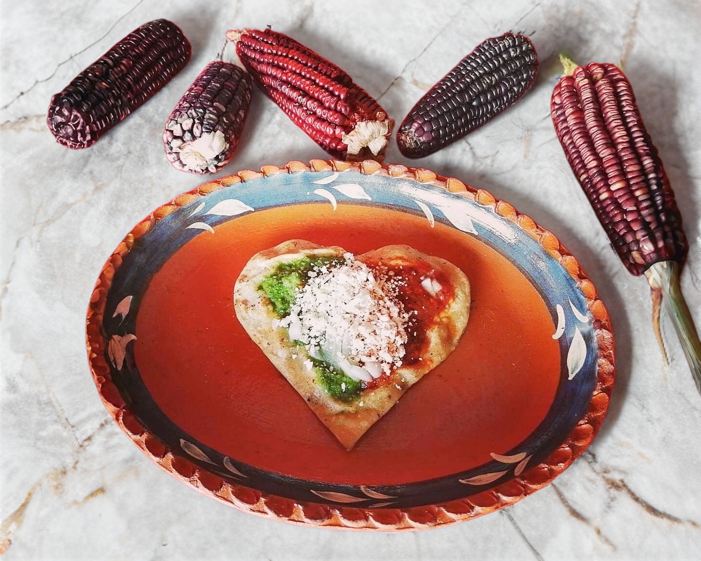 Tortilla de maíz hecha a mano en forma de corazón, cubierta de salsa a elegir, cebolla, con ingredientes a elegir.