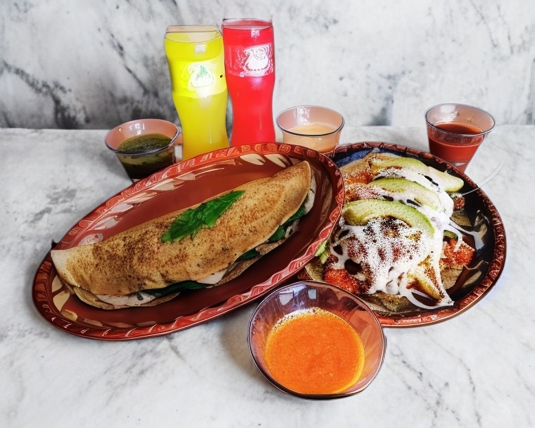 2 Tortillas de maíz hechas a mano, con arroz, papas a la francesa, nopal, huevo hervido , quesillo, aguacate, rajas y salsa a elegir.