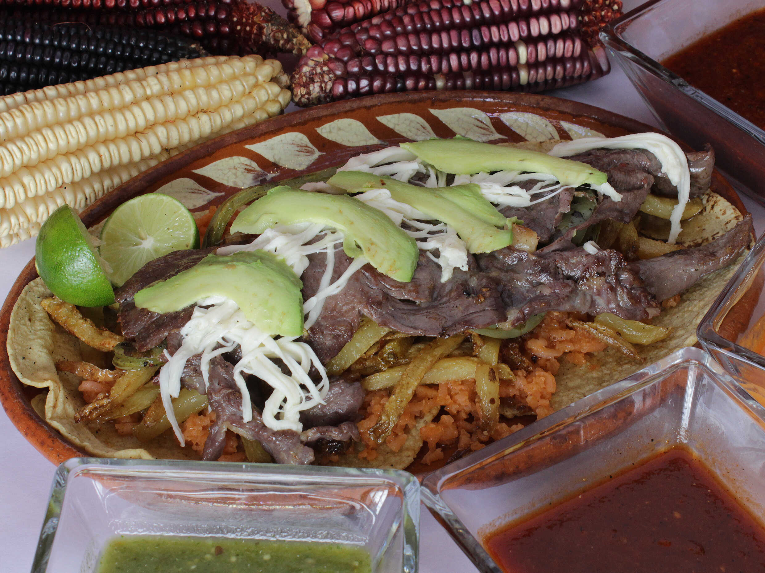 Son 2 tortillas de maíz hechas a mano, con arroz, papas a la francesa, nopal, bistec, chorizo, quesillo, aguacate, salsa y rajas.