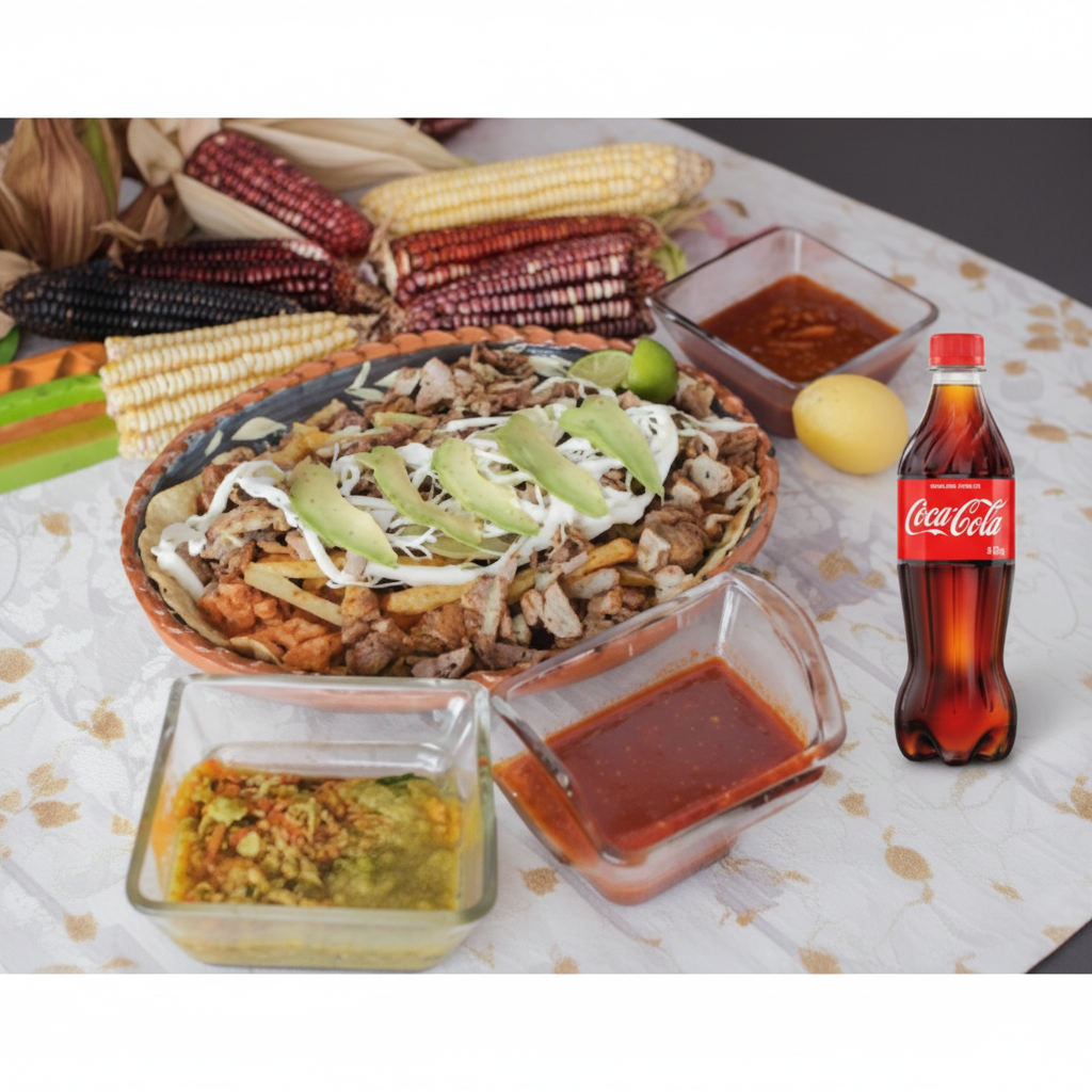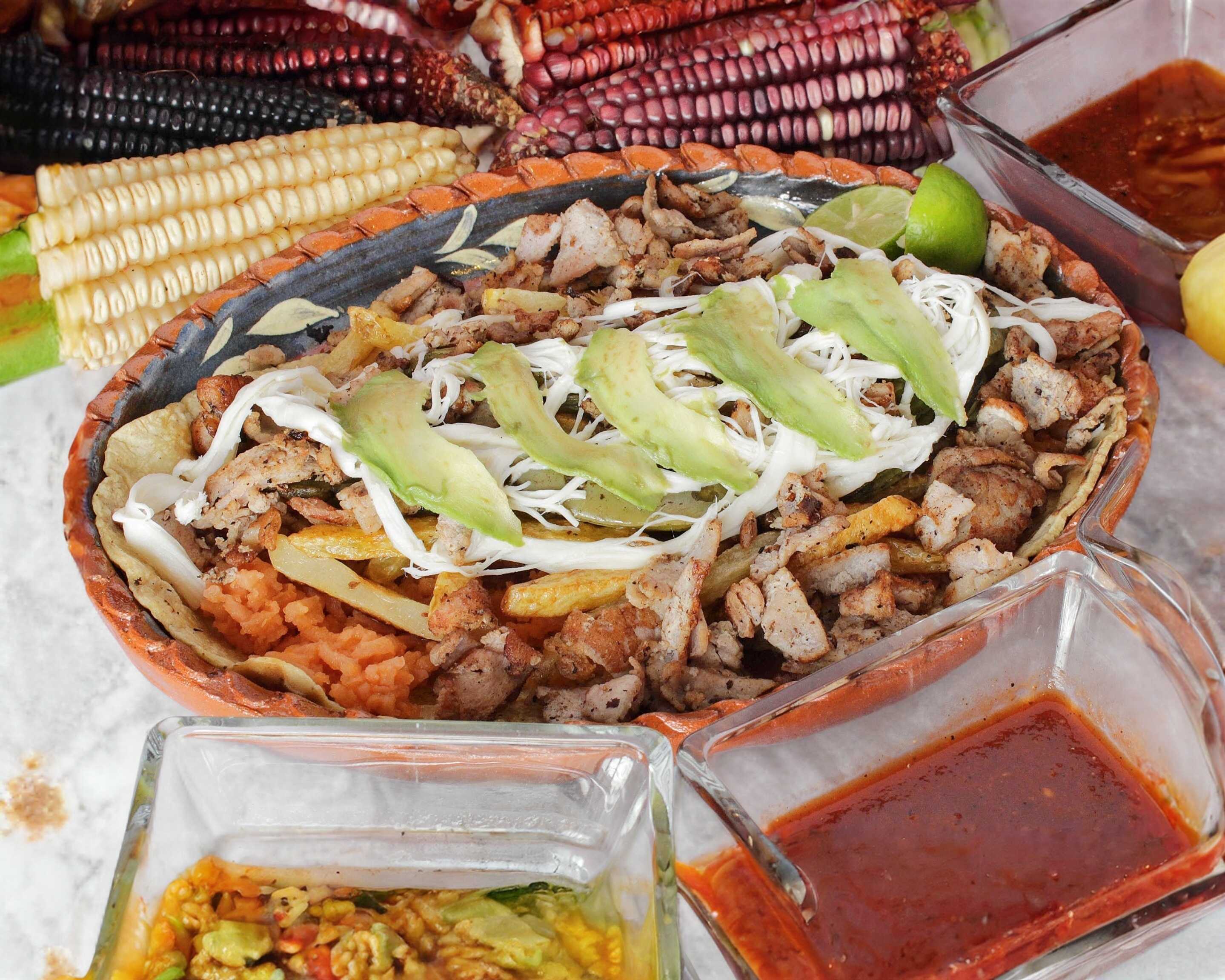 Son 2 tortillas de maíz hechas a mano, con arroz, papas a la francés, nopal, bistec, chorizo, quesillo, aguacate, salsa y rajas.