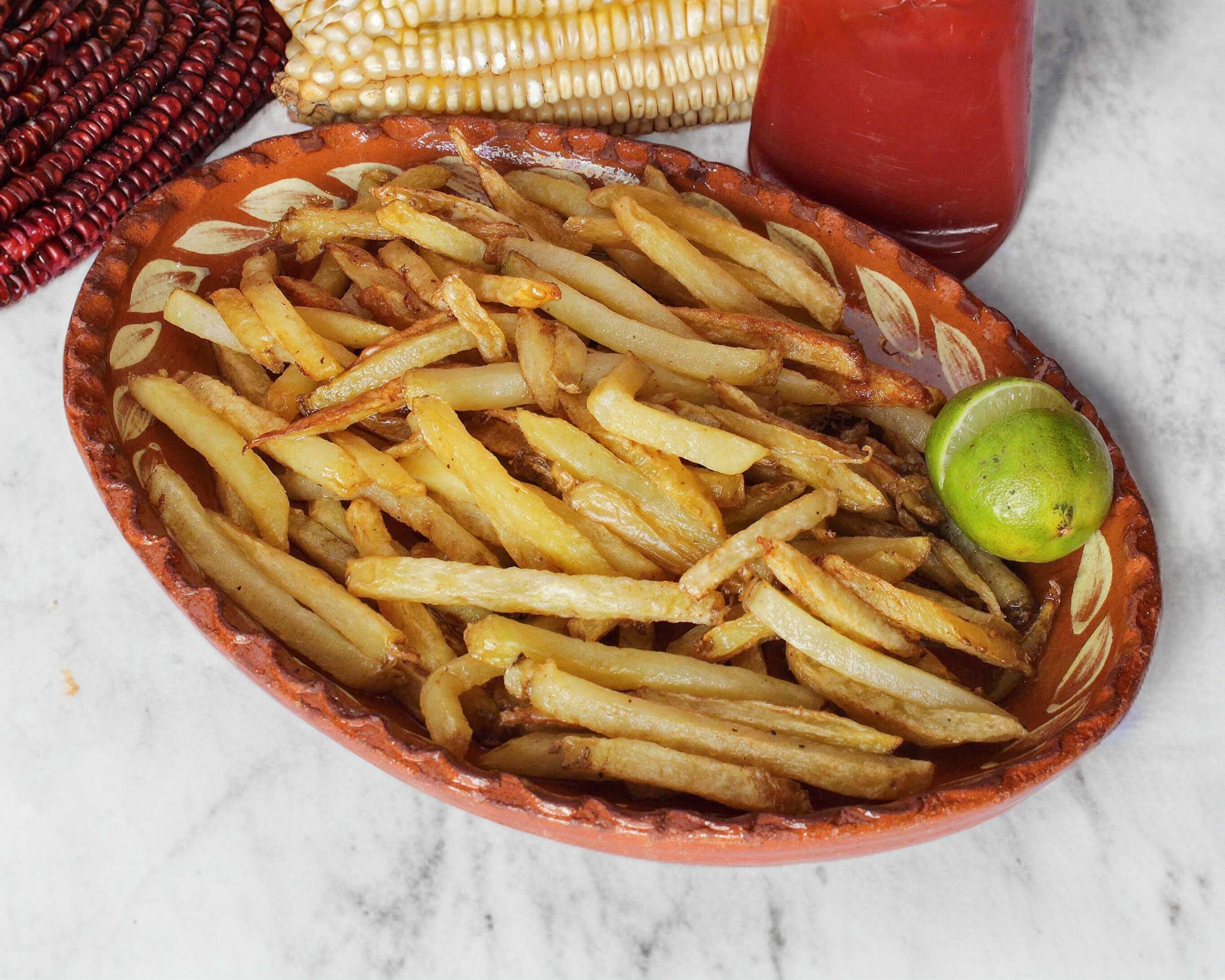 Son 2 tortillas de maíz, hechas a mano, con arroz, papas a la francesa, nopal, chorizo, quesillo, rajas.