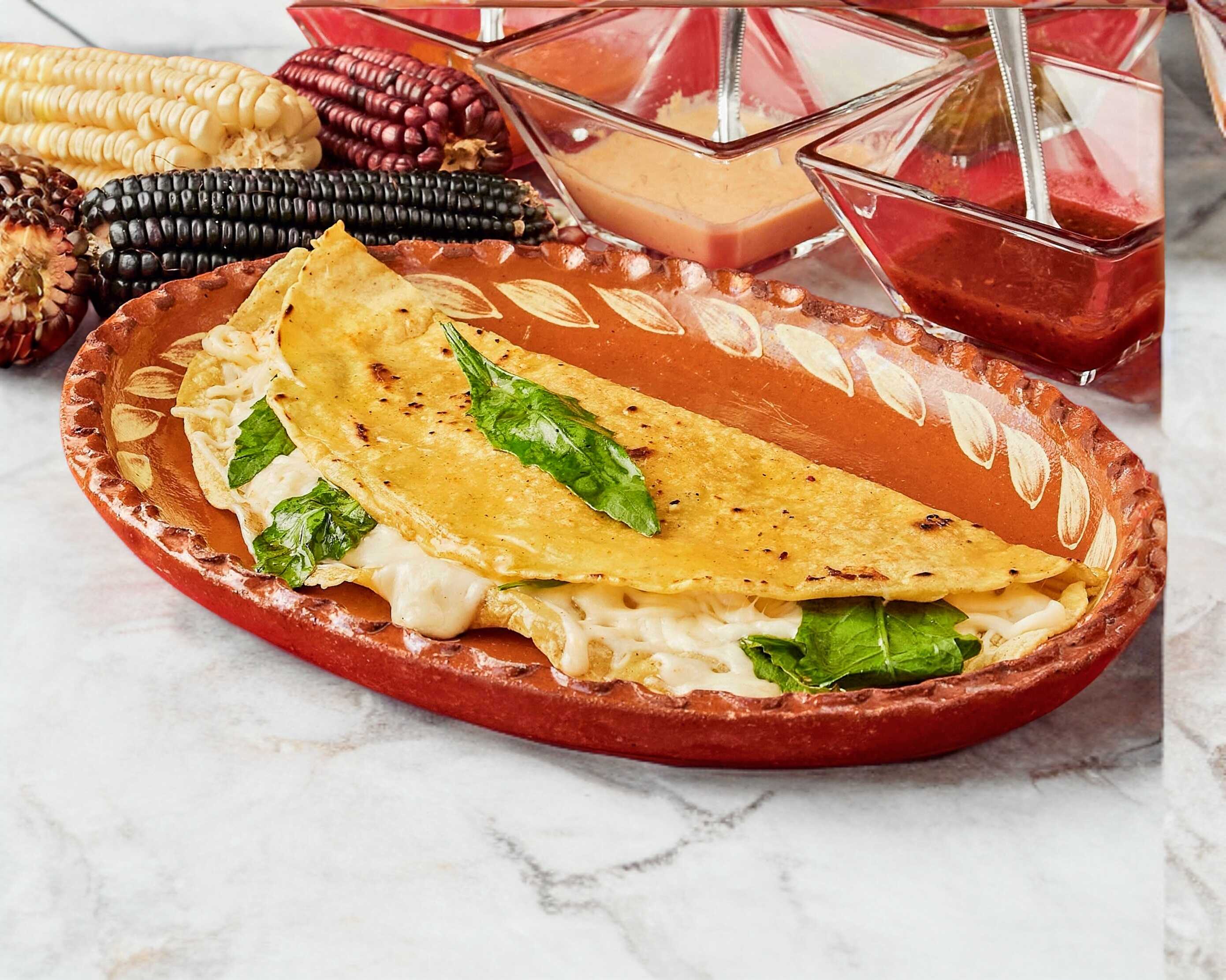 Tortilla de maíz doblada a la mitad rellena de quesillo y chapulines más los ingredientes que prefiera.