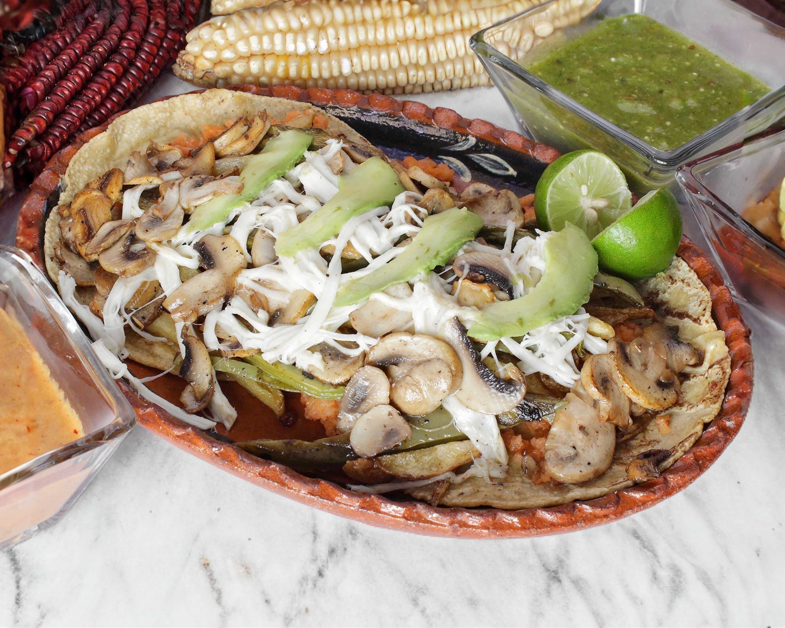 Son 2 tortillas de maíz hechas a mano, con arroz, papas a la francés, nopal, champiñones , quesillo, aguacate, salsa y rajas.