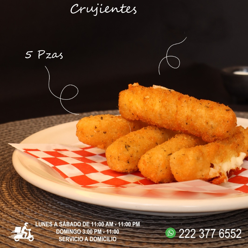 5 Pzs. Crujientes rellenos de queso Mozarella, incluye Aderezos: Queso amarillo y Ranch