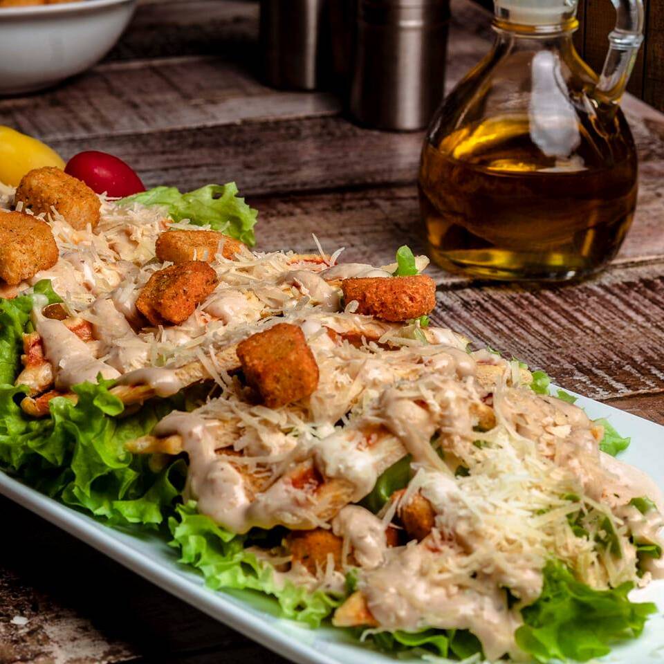 Pechuga o camarones a la parrilla sobre una cama de lechugas frescas, crutones y queso parmesano bañado con aderezo casero hecho con anchoas.