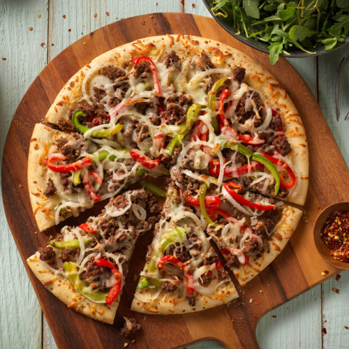 Grande 35 cm 8 rebanadas , selecta carne molida, pimiento morrrón, cebolla morada, calabacitas y un toque de orégano.