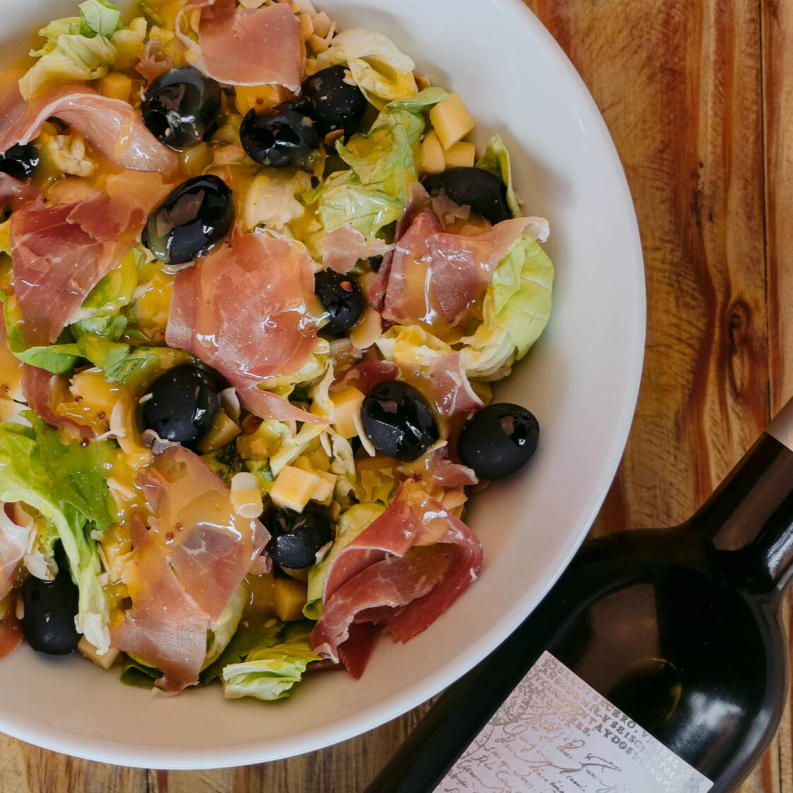 Combinación de lechugas frescas, jamón serrano, aceitunas negras, almendras fileteadas y cubitos de queso gouda bañados en aderezo de mostaza miel.