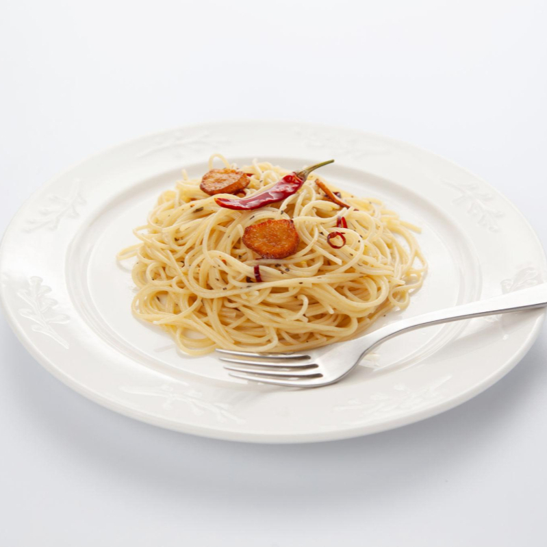 450 gramos, salsa de tomate fresca, sazonada con ajo, vino blanco, jamón serrano con un toque de pimiento triturado picosito.