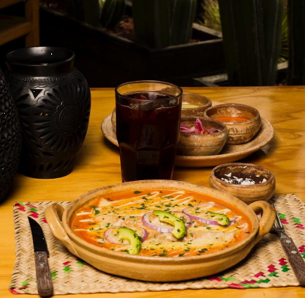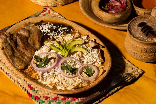 Totopos fritos bañados en salsa verde, roja, morita o frijol, con queso, crema y cebolla. Complemento a aelegir: Tasajo, cecina enchilada, chorizo, pollo o huevo