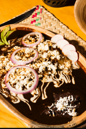 Tres envueltos de mole negro oxaqueño, rellenos de pollo, servidos con queso fresco, crema y cebolla