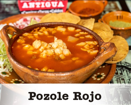 Pozole grande (1L) acompañado de cebolla, rábano, lechuga, chilito en polvo, orégano, tostadas y chicharrón.