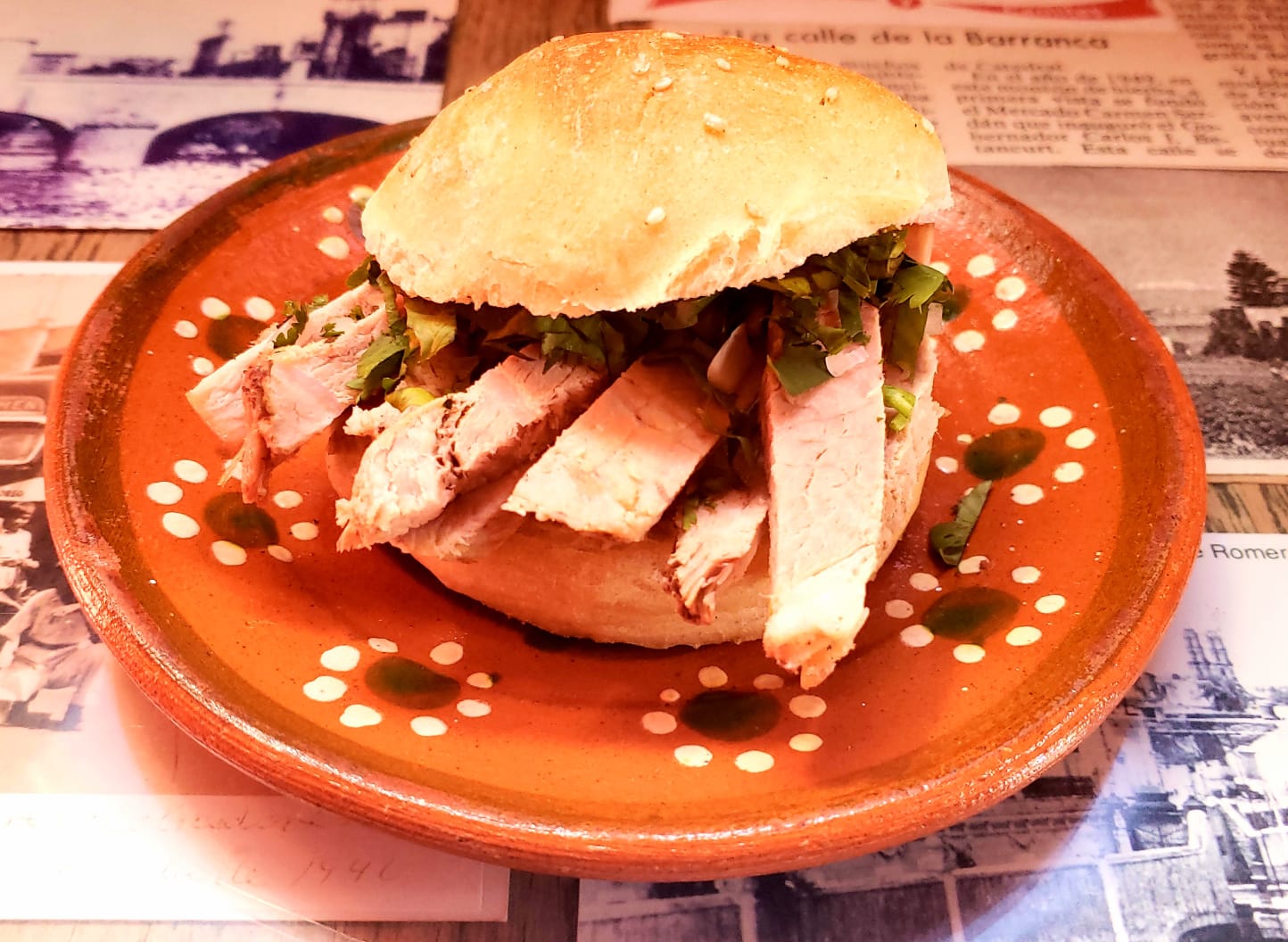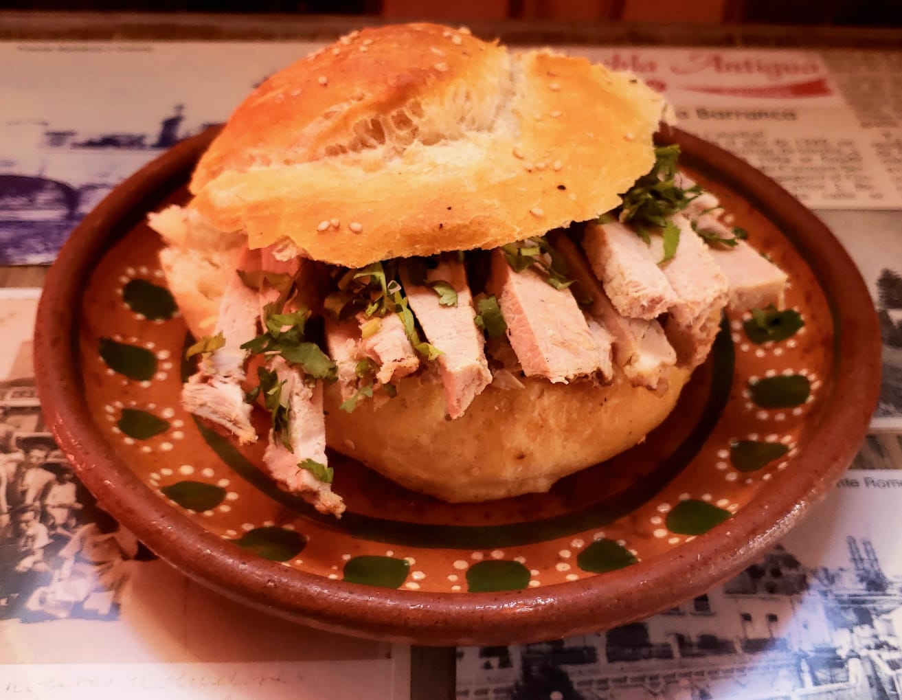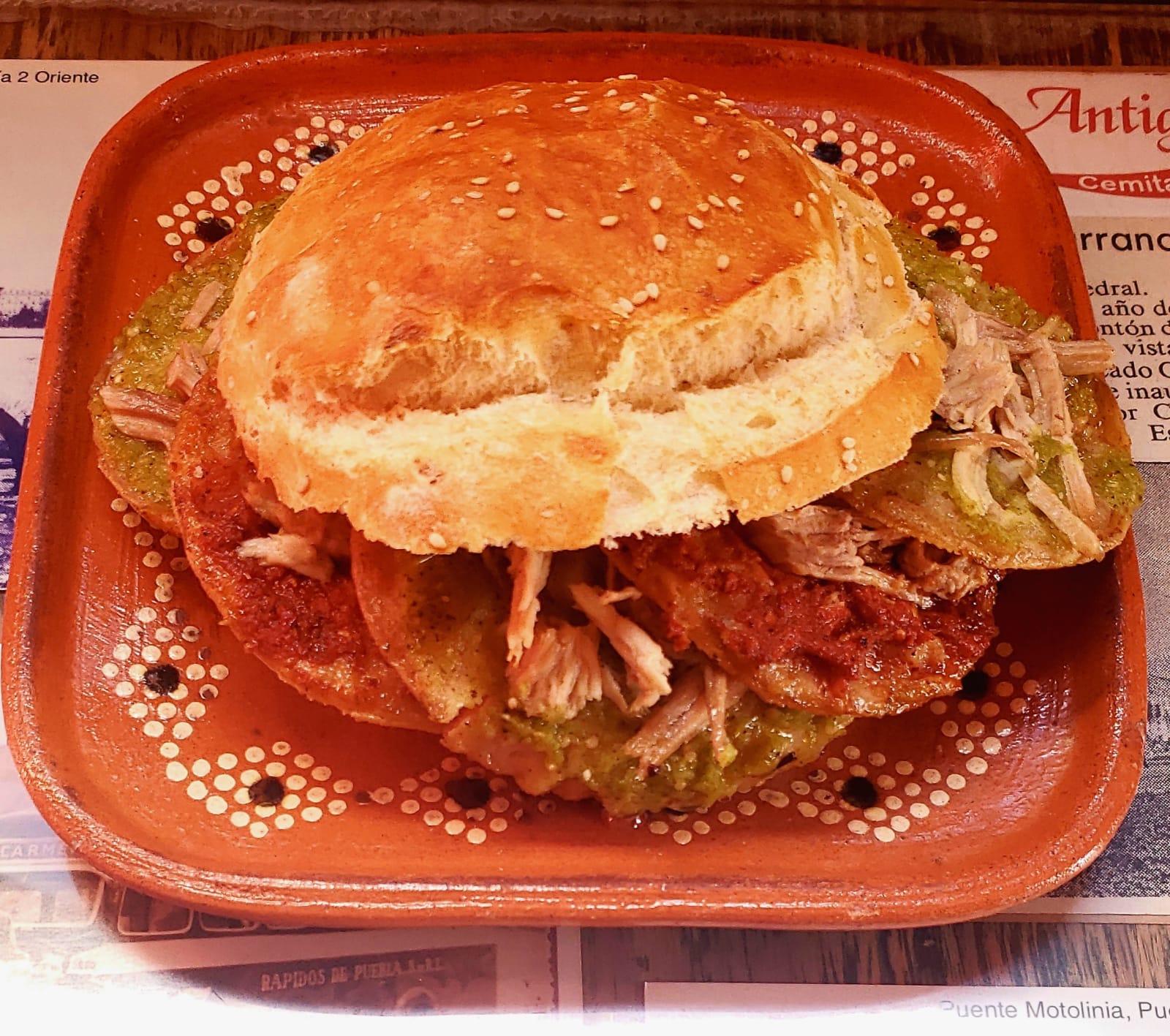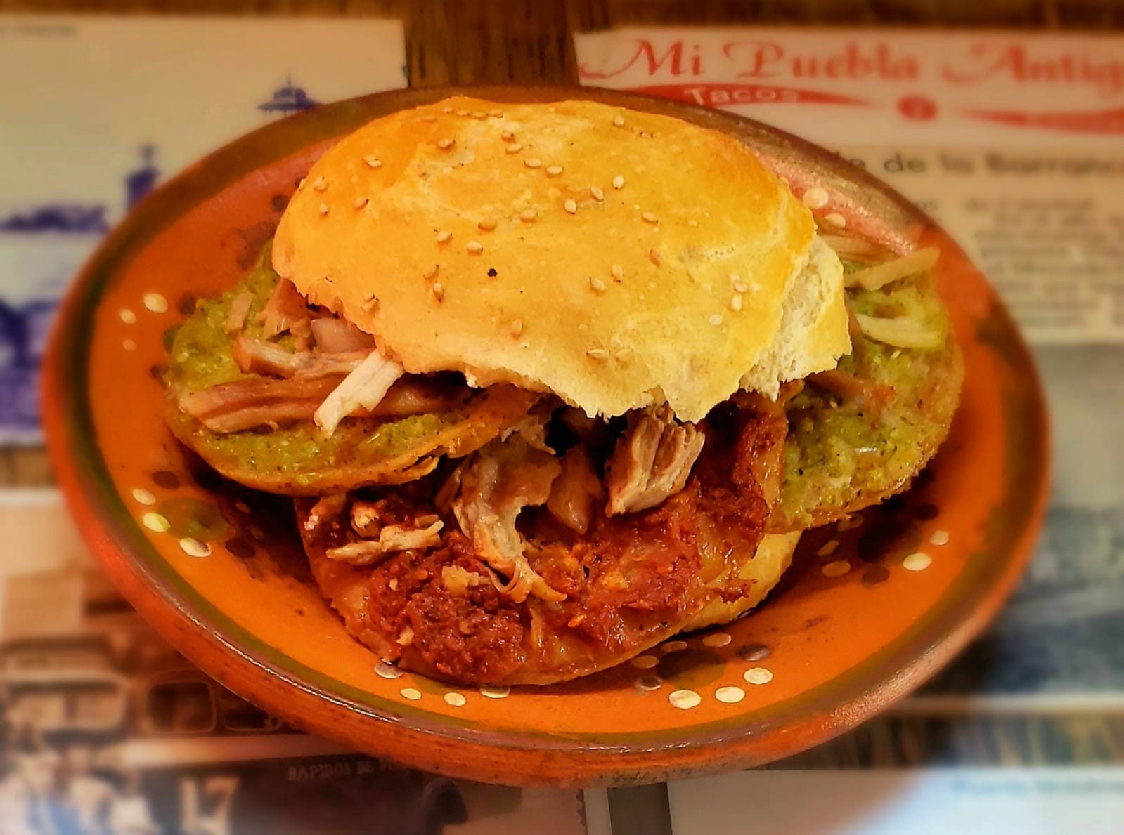 Cemita de Pierna Adobada, acompañada con, quesillo, aguacate, cebolla, pápalo, frijoles y picante.