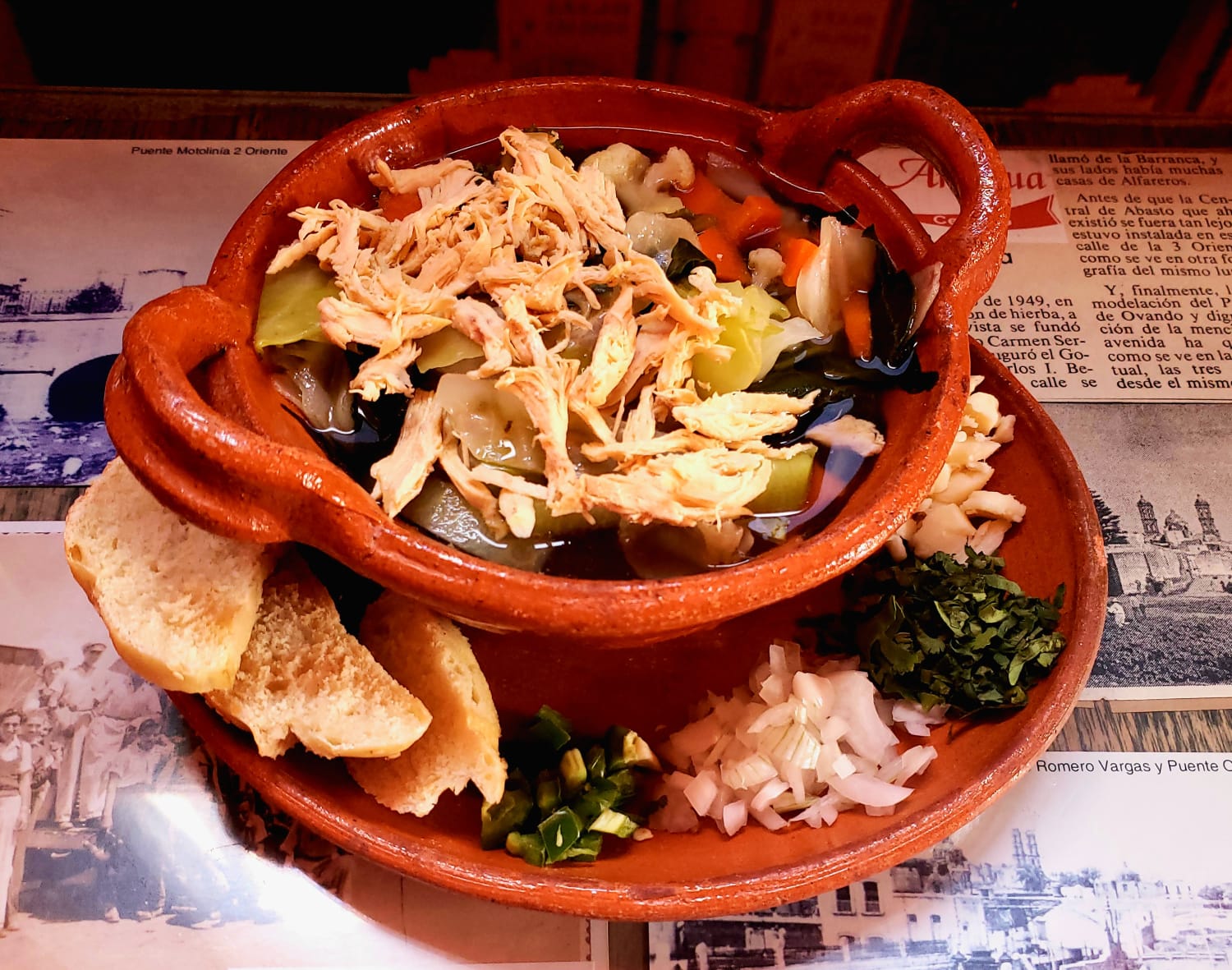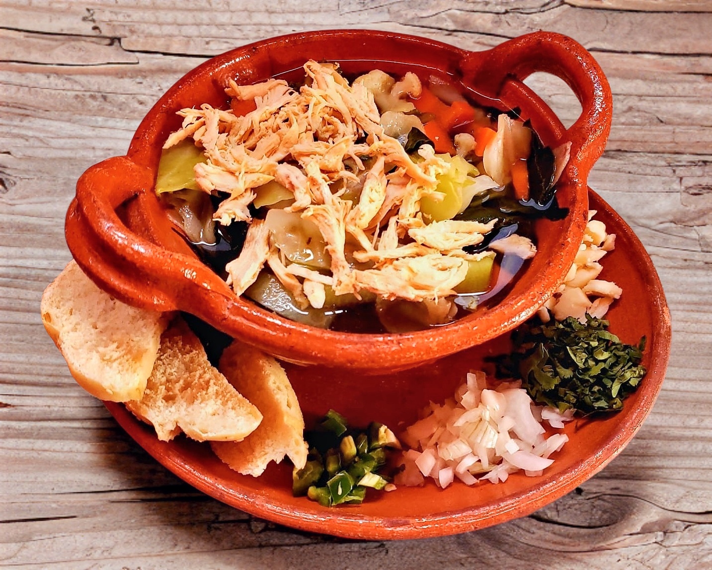 Consomé con pechuga de pollo deshebrada acompañado con verduras mixtas.