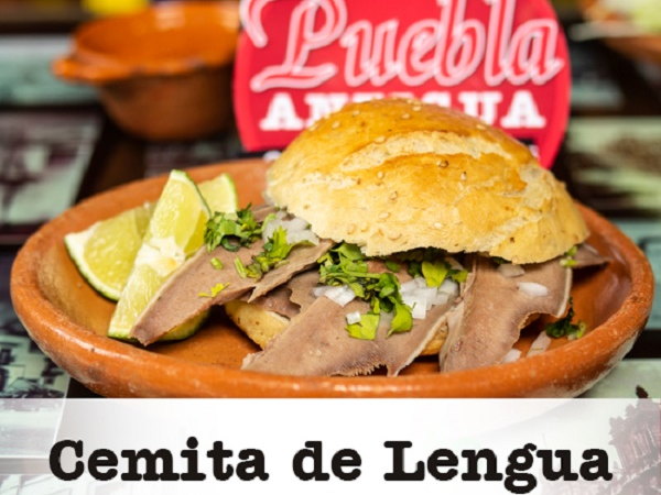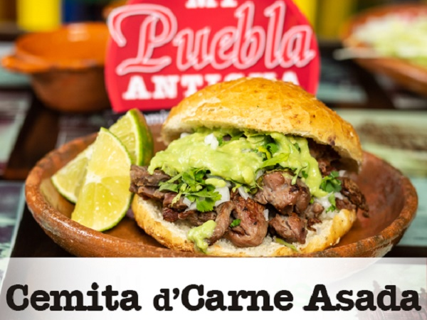 Cemita de quesillo, acompañada con aguacate, cebolla, pápalo y frijoles.