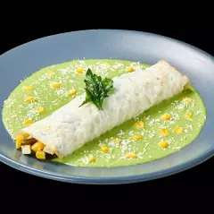Tortilla de huevo con queso manchego rellena de crema, queso y elote