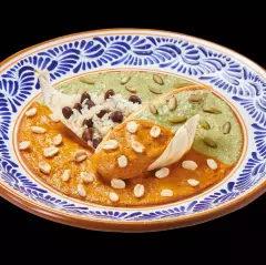 (3 pzas) Tortillas bañadas con nuestros tradicionales moles, pipian rojo, verde y el mole de Mi Viejo Pueblito