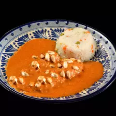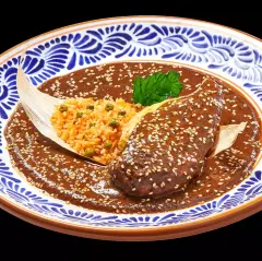 (130 gr) Nuestro tradicional mole poblano con nuestra receta única. Acompañado de arroz rojo