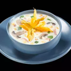 (250 ml) Acompañada de calabazas, rajas poblanas, champiñones, flor de calabaza, pollo y un toque de leche