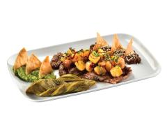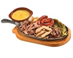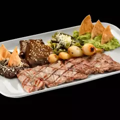 (para 2 pax) Chistorra (120 gr), cecina (90gr), filete (90 gr), arrachera (90 gr), pechuga de pollo (90 gr), nopal asado, cebollitas cambray, acompañada de queso fundido