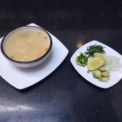 (250 ml) Caldo de pollo con calabaza,ejote garbanzo y caldillo de jitomate con un toque de epazote