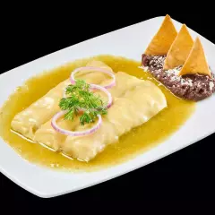 (3 pzas) Rellenas de pollo, bañadas en salsa verde o roja, con guarnición de frijoles, totopoos y queso