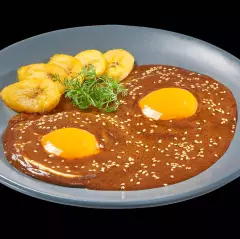 Sobre tortilla frita, bañados con nuestro tradicional mole poblano, ajonjolí y plátanos fritos