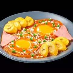 Bañados con salsa roja, chicharos, jamón cocido y plátano macho