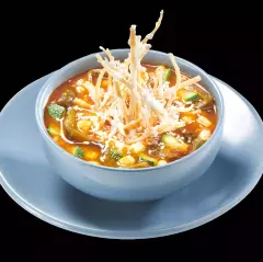 (250 ml) Con calabaza, grano de elote, rajas poblanas en caldillo de jitomate con un toque de epazote