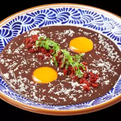 Con base de tortilla frita, queso panela, salsa a base de frijol negro con chile chiltepin y chorizo acompañado de queso fresco