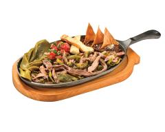 (200 gr) Fajitas asadas y sazonadas, con rajas rajas poblanas y tocino, acompañadas de frijoles, queso panela, pico de gallo y nopal asado