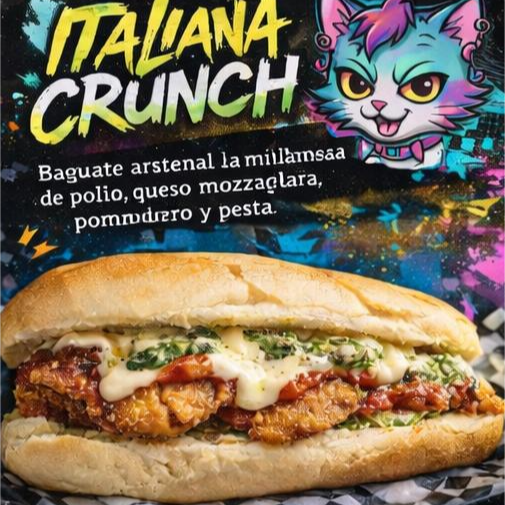 Baguette artesanal con milanesa de pollo, salsa pomodoro, queso mozzarella y pesto casero