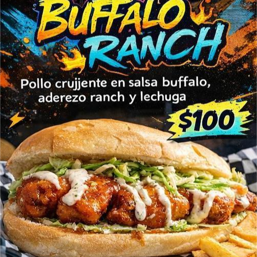 Pollo crujiente bañado en salsa buffalo con ranch, lechuga y jitomate