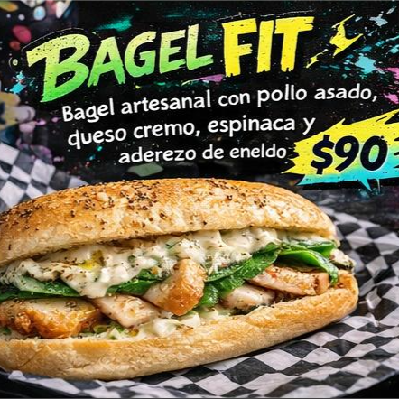 Bagel artesanal con pollo asado, queso crema, espinaca y aderezo de eneldo