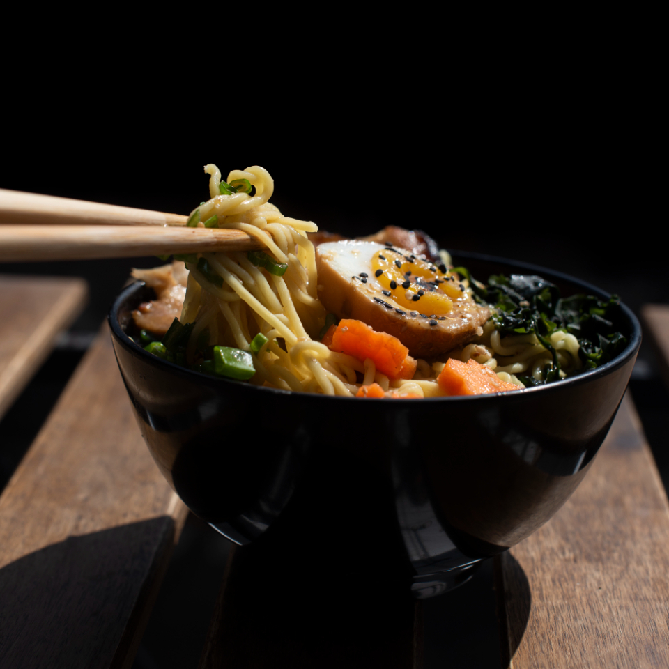 Fideos de trigo, con una caldo a base de hueso de cerdo, con pork belly, zanahoria, cebollín, alga wakame, huevo duro, ajonjoli y aceite de cebolla jengibre