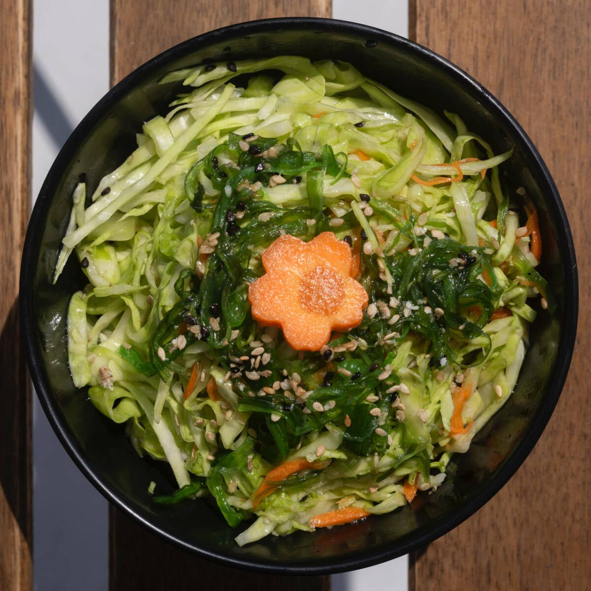 Fideo de trigo, con caldo a base de pasta de frijol de soya, pollo, zanahoria, alga wakame, huevo duro, ajonjoli, aceite de jengibre cebolla.