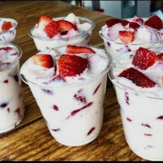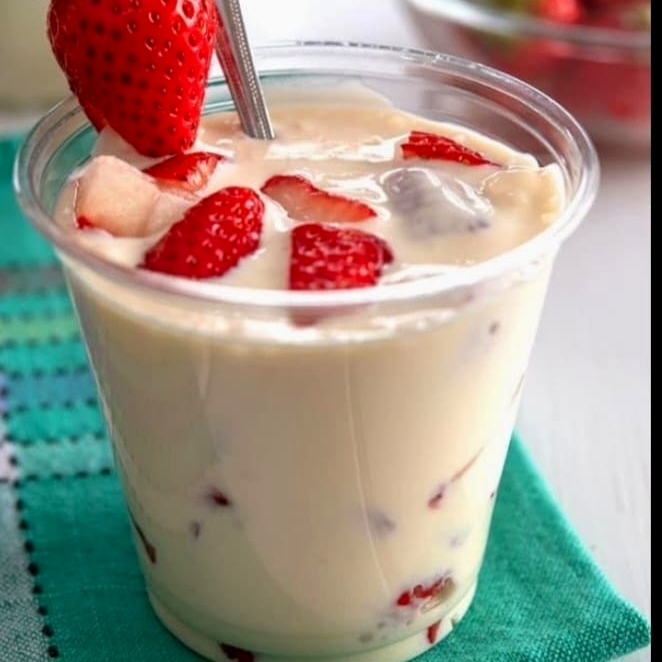Delicioso postre con fruta natural, rica y fresca, bañada en crema, vaso de 16 oz.