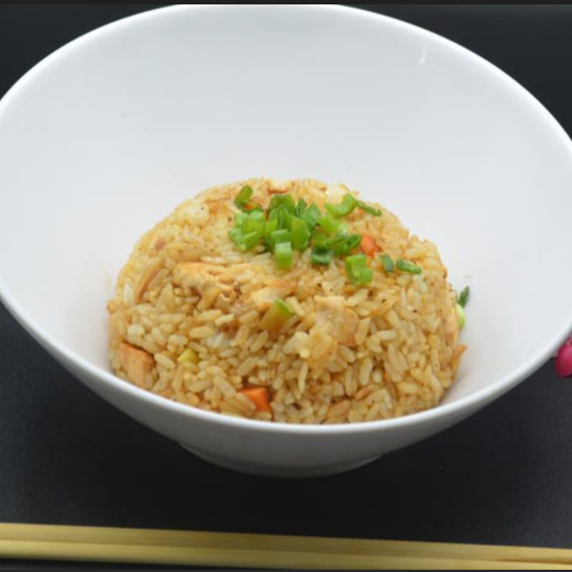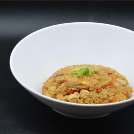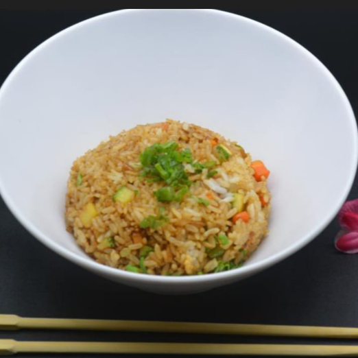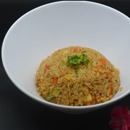 Arroz frito a la plancha con verduras bañadas con salsa de soya camarón, salmón y huevo