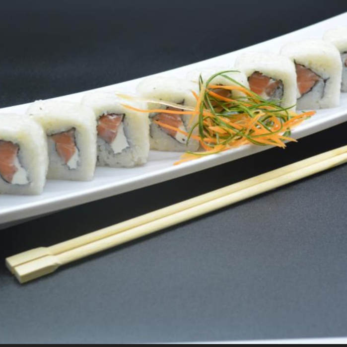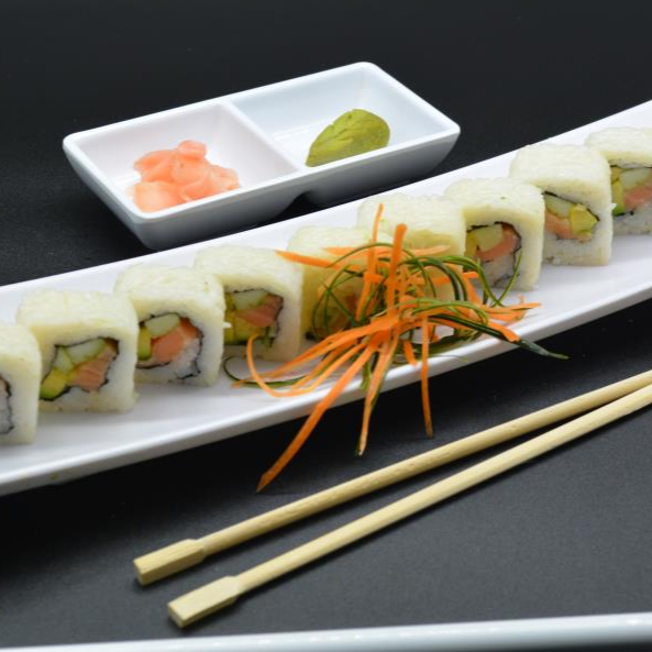 Salmón, aguacate, philadelphia, ajonjolí, arroz, envuelto con alga.