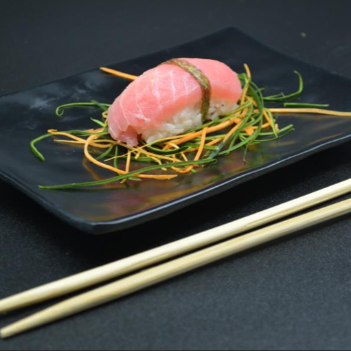 Bocados de arroz con pescado fresco, una delicadeza japonesa que combina la suavidad del arroz con el sabor del pescado.