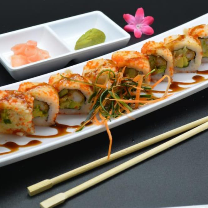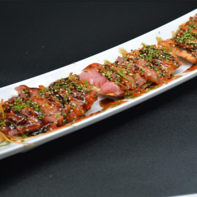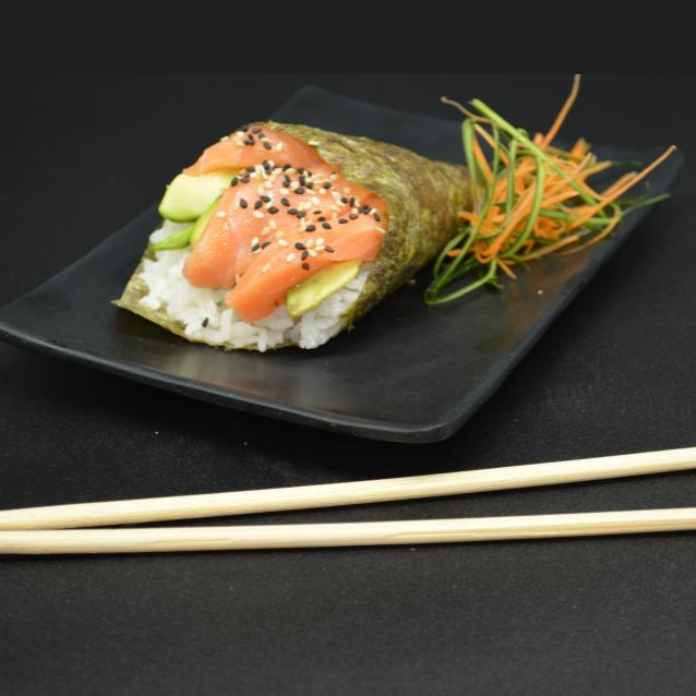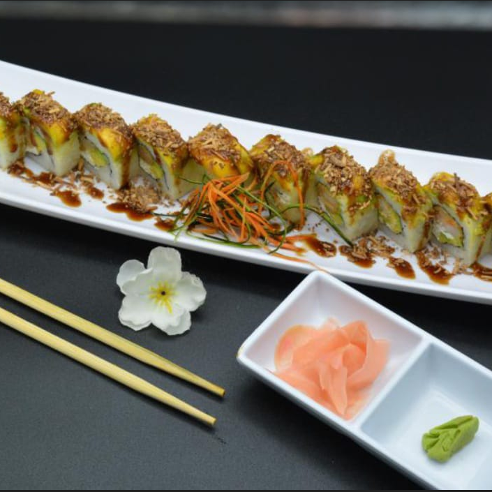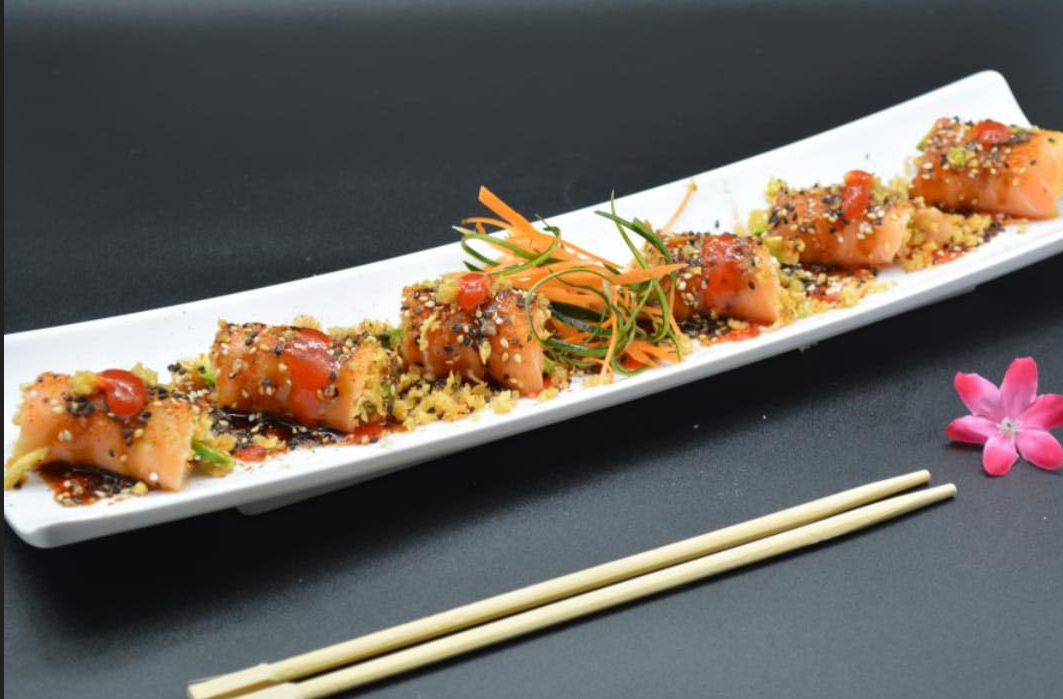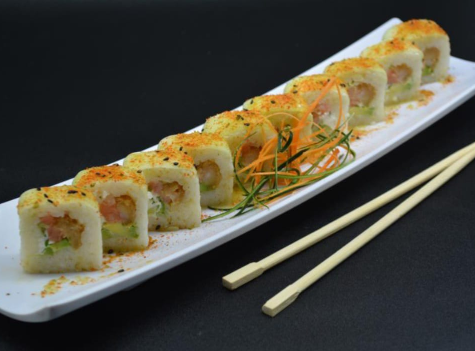 Papel de arroz, lechuga y chispas tempura, envuelto con salmón fresco, bañadas con salsa dulce, sriracha, soya y furikake de camarón.