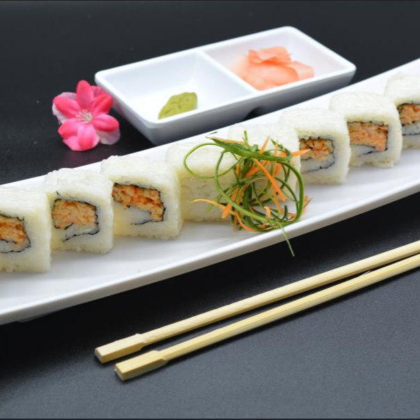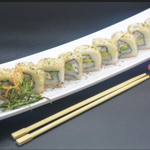 Pepino, camarón, aguacate, arroz, ajonjolí y envuelto en alga.
