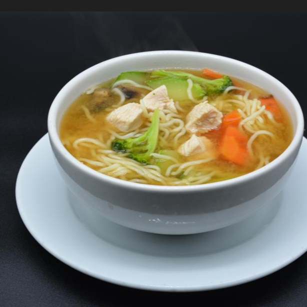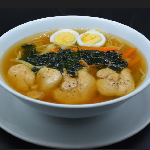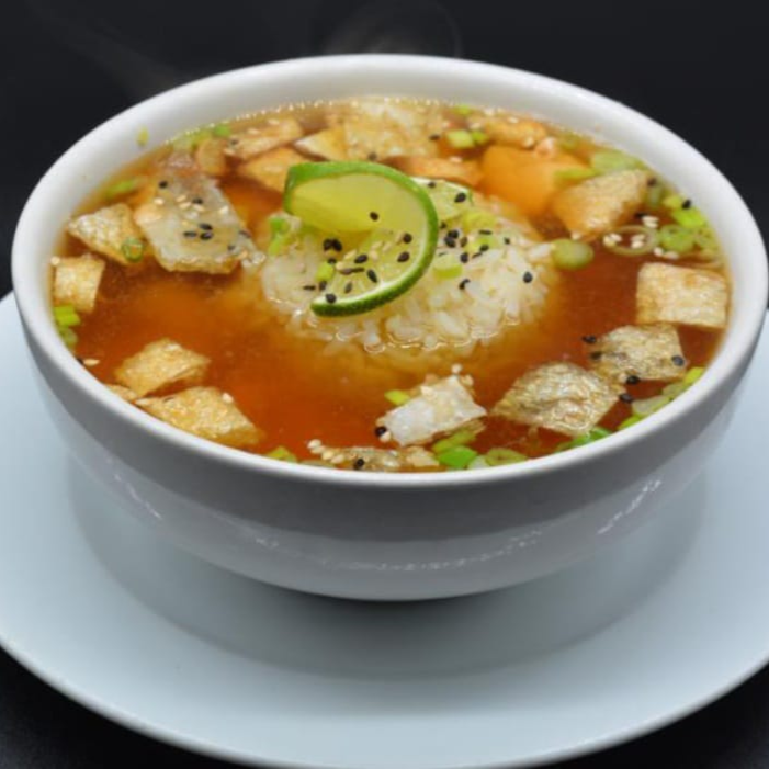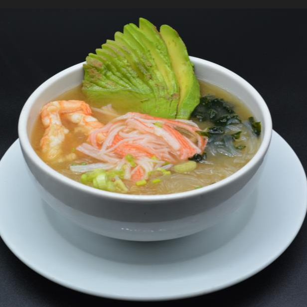 Tradicional sopa japonesa condimentada con polvo misu, hondashi, soya natural, kanikama, wakamen, camarón, cebollín, pasta harusamen, aguacate y naruto.